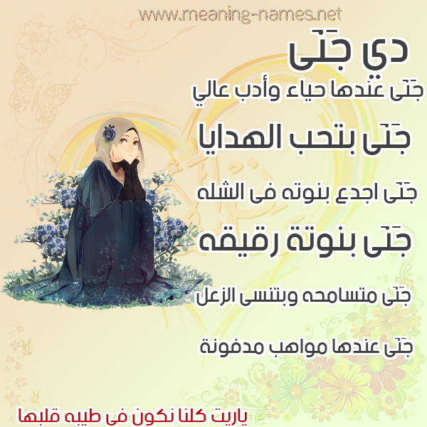 و اسم علم مؤنث عربي. وقد مالوا إلى التسمية به جمعاً على عادتهم وابتعاداً عن قدسية المفرد منه. والجنة هي البستان في الأصل، ثم أخذت طابعاً دينياً حين وردت في القرآن كثيراً مفرداً وجمعاً دلالة على مقام أ÷ل الدين والخير والصلاح. ويقابلها جهنم. لكنهم سموا بناتهم به للجمال ولما تحويه الجنات عن طبيعة زاهية الألوان. وانظر: جِنان.