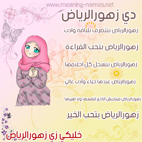 ما معنى اسمي زهورالرياض ؟ .i,vhgvdhq ? what the meaning of Zhwralryad معاني كلمة زهورالرياض قاموس الأسماء و المعاني و الكلمات .