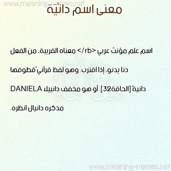 ما معنى اسمي دانْيَة ؟ ]hkXdQm ? what the meaning of DANIAH معاني كلمة دانْيَة قاموس الأسماء و المعاني و الكلمات .