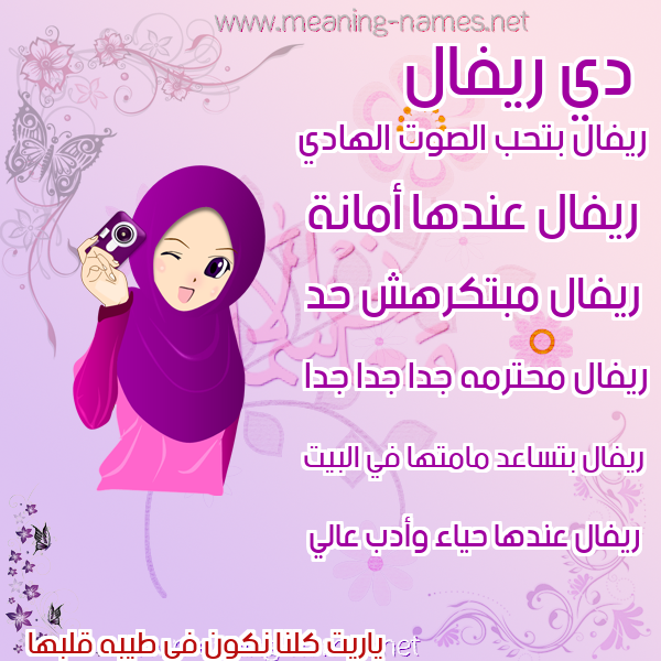 ريفالمعنى الاسم ريفالأصل الاسم عربياسم عربي وأصله رفال يعني المرأة صاحبة الشعر الطويل أي يرفل على كتفها، أو الفتاة المتبخترة في مشيها. وصاحبة اسم ريفال هي فتاة مفعمة بالأنوثة ورومانسية ورقيقة، كما أنها خجولة ولا تحب كثرة العلاقات والأماكن المزدحمة.