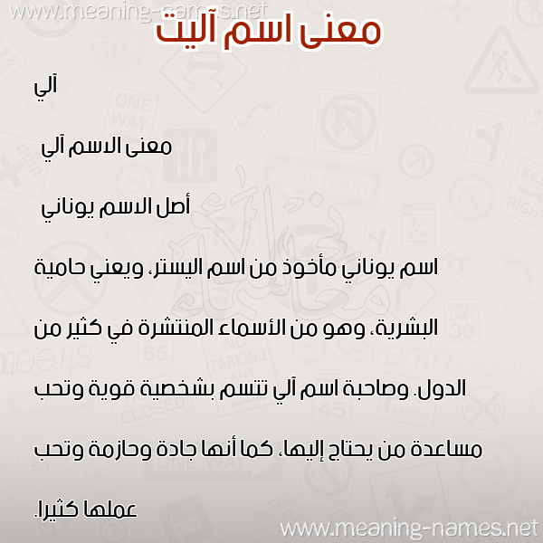 آليمعنى الاسم آليأصل الاسم يونانياسم يوناني مأخوذ من اسم اليستر، ويعني حامية البشرية، وهو من الأسماء المنتشرة في كثير من الدول. وصاحبة اسم آلي تتسم بشخصية قوية وتحب مساعدة من يحتاج إليها، كما أنها جادة وحازمة وتحب عملها كثيراً.