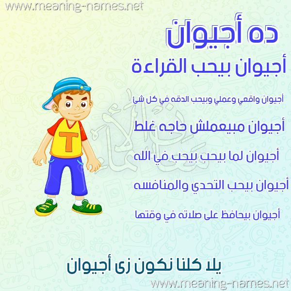 أجوانمعنى الاسم أجوانأصل الاسم عربيجمع جُون: الخليج الصغير.لوفاء والصدق والنجاة ، التوحيد ، ترك الرياء والغش ، الزُّبد بعد خلوصه من الثفل والعُكارة ، القشدة ، رأس الإيمان ، وكلمة الإخلاص عند المسلمين قول : لا إله إلا الله ، وسورة الإخلاص : سورة قل هو الله أحدلوفاء والصدق والنجاة ، التوحيد ، ترك الرياء والغش ، الزُّبد بعد خلوصه من الثفل والعُكارة ، القشدة ، رأس الإيمان ، وكلمة الإخلاص عند المسلمين قول : لا إله إلا الله ، وسورة الإخلاص : سورة قل هو الله أحدلوفاء والصدق والنجاة ، التوحيد ، ترك الرياء والغش ، الزُّبد بعد خلوصه من الثفل والعُكارة ، القشدة ، رأس الإيمان ، وكلمة الإخلاص عند المسلمين قول : لا إله إلا الله ، وسورة الإخلاص : سورة قل هو الله أحد