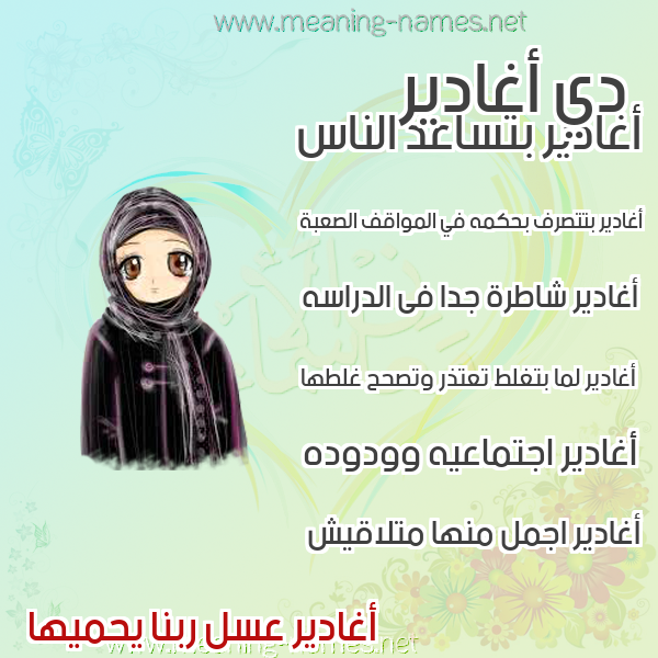 أغاديرمعنى الاسم أغاديرأصل الاسم عربيهو جمع كلمة أغادير، ويعني النهر، أو قطعة من الماء تتبقى بعد المطر أو السيول، ويوجد في المغرب مدينة تسمى أغادير، وتتميز بوجود الكثير من المعالم السياحية بها. وصاحبة اسم أغادير هي فتاة حساسة وهادئة في طباعها، تفكر كثيراً ويمكن أن تتراجع عن قراراتها إذا شعرت بالقلق، تحب التأمل والجلوس في أماكن هادئة بعيداً عن الإزدحام.بعد المطر أو السيول، ويوجد في المغرب مدينة تسمى أغادير، وتتميز بوجود الكثير من المعالم السياحية بها. وصاحبة اسم أغادير هي فتاة حساسة وهادئة في طباعها، تفكر كثيراً ويمكن أن تتراجع عن قراراتها إذا شعرت بالقلق، تحب التأمل والجلوس في أماكن هادئة بعيداً عن الإزدحام