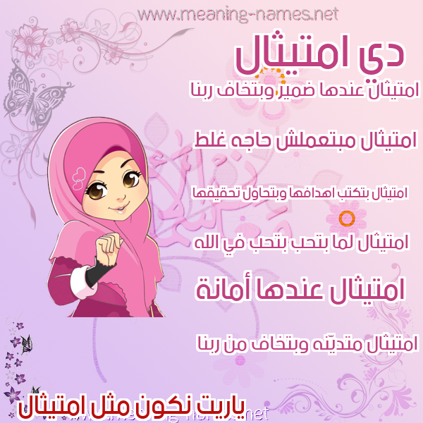 ما معنى اسمي امتيثال ؟ hljdehg ? what the meaning of Imtithal معاني كلمة امتيثال قاموس الأسماء و المعاني و الكلمات .