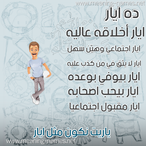 ايارمعنى الاسم ايارأصل الاسم فارسياسم فارسي يطلق على الإناث، ويعني المساعدة أو الصديقة، وهو اسم جديد وغير تقليدي، ويتميز ببساطته في النطق والكتابة. وصاحبة اسم ايار تتسم بشخصية مهذبة، تحب تكوين العلاقات الإجتماعية والصداقات، كما أنها طموحة وتحب عملها.