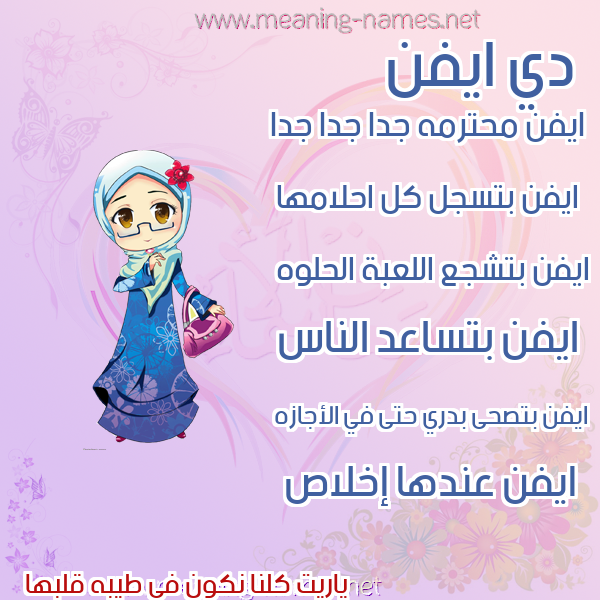 ايفينمعنى الاسم ايفينأصل الاسم كردياسم كردي يعني الحب والهيام والعشق، وهو من الأسماء المميزة في الغرب والتي تطلق على الإناث والذكور، ولكنه غير منتشر في الدول العربية، وله معنى آخر وهو رامي السهام الصغير. وصاحب اسم ايفين هو شخص رومانسي وهاديء الطباع، كما أنها دقيق وقوي الملاحظة، ويحب النجاح والمنافسة في العمل، ومع هذا يعطي حياته الشخصية إهتمام كبير.