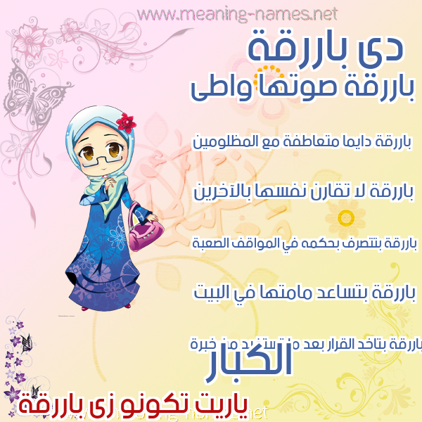 ما معنى اسمي باررقة ؟ fhvvrm ? what the meaning of Bariqa معاني كلمة باررقة قاموس الأسماء و المعاني و الكلمات .