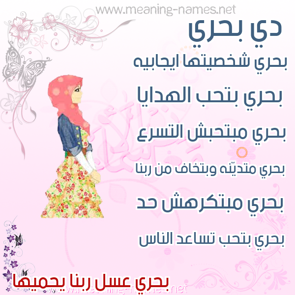 ( بَحْرِيَّة ) : المنسوب إلى البحر .و معنى الاسم بحري الشّخصيّة الانبساطيّة: هي شخصيّة طيّبة القلب، مَرِحة، وحسنة المُعاملة، يُحبّها النّاس، واثقة بنفسها وبالآخرين، سريعة في اتّخاذ القرارات، غير مُنظَّمة، ولا تُحافِظ على المواعيد، تُحبّ سماع المدح وكثرة الإطراء من الغير، وتكره العمل. الشّخصيّة الإيجابيّة: نظرة صاحب هذه الشخصية إيجابيّة للأمور، هادئ وبشوش، ذكيّ ومُتحمّس، يتّخذ قراراته بعقلانيّة، ويُفاوض ببراعة ويُصغي للآخرين.