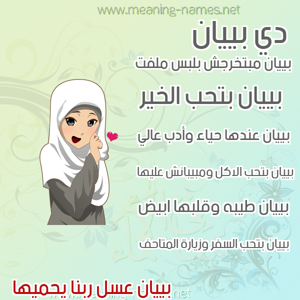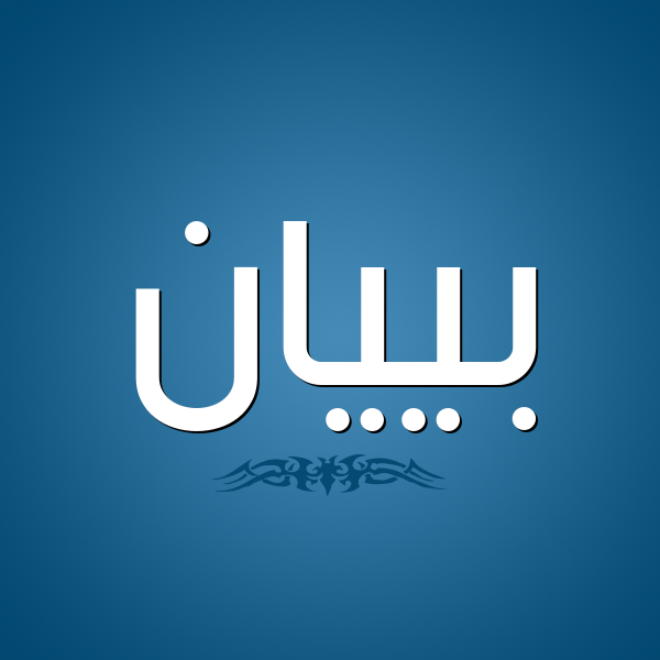 بيانمعنى الاسم بيانأصل الاسم عربياسم عربي يطلق على الذكور والإناث، وله أكثر من معنى، فالبيان ينسب للظبي الذي يعرف بالخفة والجمال والسرعة، أما بيان بفتح الباء فيعني الوضوح والظهور والمعرفة. ولقد ذكرت كلمة بيان في القرآن بعدة مواضع، ففي سورة الرحمن يقول الله تعالى " علَّمه البيان"، وفي سورة آل عمران يقول الله تعالى " هَٰذَا بَيَانٌ لِلنَّاسِ وَهُدًى وَمَوْعِظَةٌ لِلْمُتَّقِينَ". وصاحب اسم بيان هو شخص يتمتع بالعديد من الصفات الحسنة مثل الإخلاص والأمانة، كما أنه يحب الصراحة ولا يجامل، وصاحب شخصية جادة في العمل، ويحب الثقافة والتطلع.اسم عربي يطلق على الذكور والإناث، وله أكثر من معنى، فالبيان ينسب للظبي الذي يعرف بالخفة والجمال والسرعة، أما بيان بفتح الباء فيعني الوضوح والظهور والمعرفة. ولقد ذكرت كلمة بيان في القرآن بعدة مواضع، ففي سورة الرحمن يقول الله تعالى " علَّمه البيان"، وفي سورة آل عمران يقول الله تعالى " هَٰذَا بَيَانٌ لِلنَّاسِ وَهُدًى وَمَوْعِظَةٌ لِلْمُتَّقِينَ". وصاحب اسم بيان هو شخص يتمتع بالعديد من الصفات الحسنة مثل الإخلاص والأمانة، كما أنه يحب الصراحة ولا يجامل، وصاحب شخصية جادة في العمل، ويحب الثقافة والتطلع.