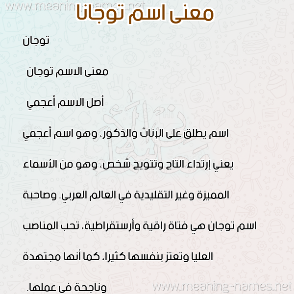 ما معنى اسمي توجانا ؟ j,[hkh ? what the meaning of togana معاني كلمة توجانا قاموس الأسماء و المعاني و الكلمات .