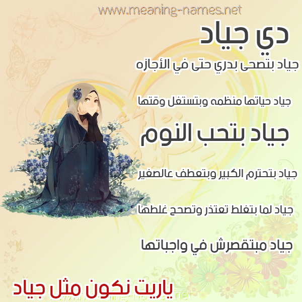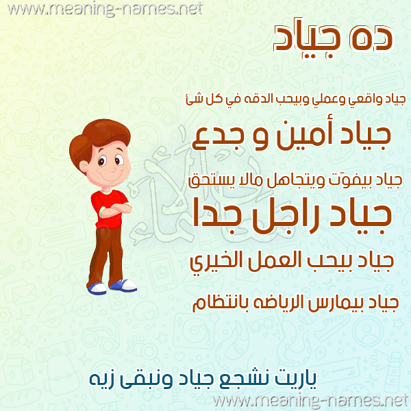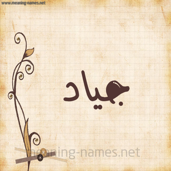 جيادمعنى الاسم جيادأصل الاسم عربياسم عربي يطلق على الذكور وهو جمع جواد أي الفرس أو الخيل النجيب، والفرس الجواد هو الفرس سريع الجري، وجِياد بكسر الجيم هو جمع جيد أي الشخص الحسن الصفات. وصاحب اسم جياد يتميز بشخصية الجذابة والقوية، كما أنه شجاع ويحب المغامرات، ومتسرع في قراراته، كما أنه خلوق ومهذب.اسم عربي يطلق على الذكور وهو جمع جواد أي الفرس أو الخيل النجيب، والفرس الجواد هو الفرس سريع الجري، وجِياد بكسر الجيم هو جمع جيد أي الشخص الحسن الصفات. وصاحب اسم جياد يتميز بشخصية الجذابة والقوية، كما أنه شجاع ويحب ال