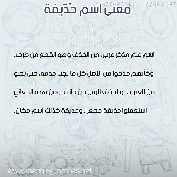 اسم علم مذكر عربي، من الحَذْف وهو القطع من طرفٍ. وكأنهم حذفوا من الأصل كلَّ ما يجب حذفه، حتى يخلوَ من العيوب. والحذف: الرميُ من جانب. ومن هذه المعاني استعملوا "حُذيفة" مصغراً. وحذيفة كذلك: اسم مكان.