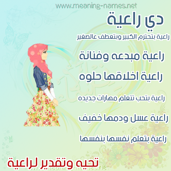 ما معنى اسمي راعية ؟ vhudm ? what the meaning of RAAIH معاني كلمة راعية قاموس الأسماء و المعاني و الكلمات .
