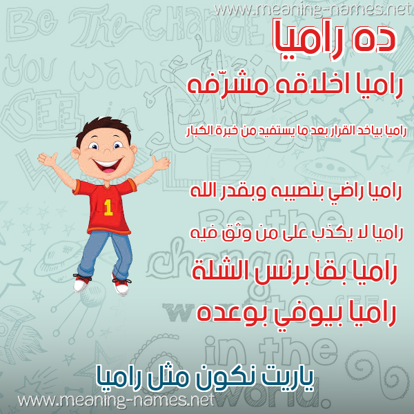 راميامعنى الاسم رامياأصل الاسم عربيلهذا الإسم في اللغة العربية أكثر من معنى، فالراميه هي التي لا تحمل الهم، وترمي أعباءها خلف ظهرها، والمعنى الثاني هو التي تتباهى وتتفاخر بنفسها ولا تهتز من أي حديث يوجه لها، فيعني الإعتزاز بالنفس ومعرفة قدراتها. كما أن هناك معنى آخر وهو من تلقى السهام، فيقال رامية السهام. ويمكن أن يتم كتابة الإسم بالهاء "راميه" أو التاء المربوطة "رامية" أو الألف "راميا". وصاحبة إسم راميه هي فتاة دؤوبة، تأخذ الأمور ببساطة ومتفاءلة في حياتها، ولديها كبرياء كبير وتشعر بقيمتها في المجتمع الذي تعيش فيه، وهي نشيطة ومرحة، ولديها لباقة في الحديث، كما أنها تستطيع التعبير عن وجهة نظرها بوضوح.