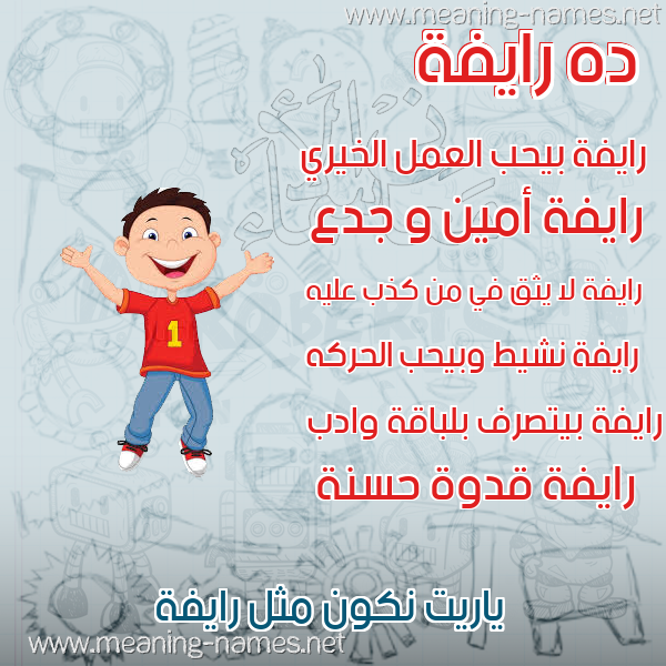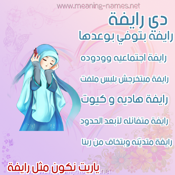 ما معنى اسمي رايفة ؟ vhdtm ? what the meaning of Rafeya معاني كلمة رايفة قاموس الأسماء و المعاني و الكلمات .