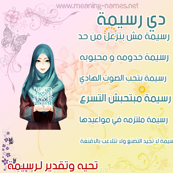 ما معنى اسمي رسيمة ؟ vsdlm ? what the meaning of Rasima معاني كلمة رسيمة قاموس الأسماء و المعاني و الكلمات .