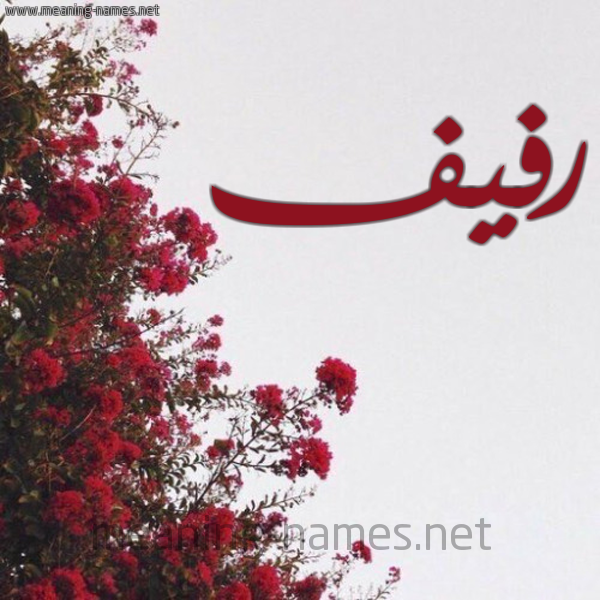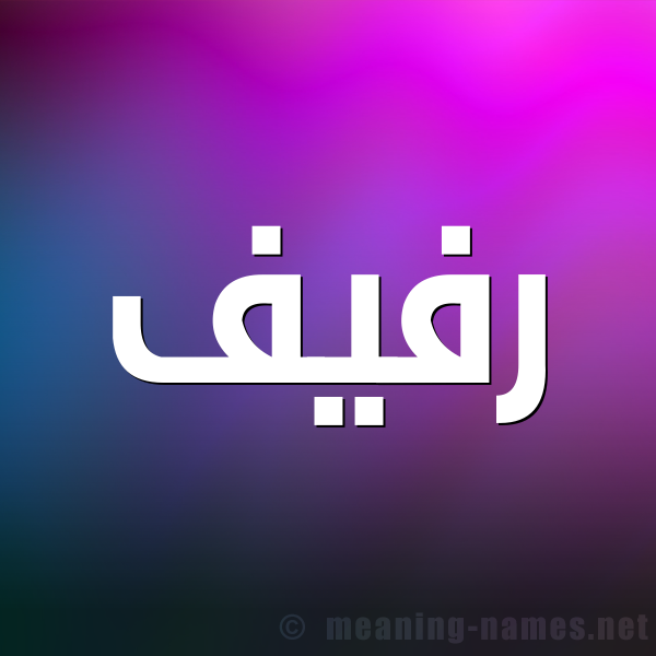 ذو الأخلاق الحسنة ، التلألؤ والبريق ، النعومة ، المُندّى من الشجر وغيره ، الخصب ، السقف ، تمايل النبات الأخضر النّضر وامتداده ، الملابس الرقيقة ، والسَّوسن .و الخصب حسن الخلقو معنى الاسم رفيف : (أسماء مشتركة) سقف، و- روشن، و- سفن كان يُعْبَرُ عليها، وهي أن تنضّد سفينتان أو ثلاث للملك، وأرَفّت الدجاجة على بيضها: بسطت الجناح.