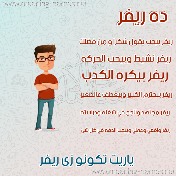 ريفرمعنى الاسم ريفرأصل الاسم إنجليزياسم مذكر مستوحى من الطبيعة، ويعني النهر أو تدفق الماء، وهو من الأسماء الجميلة التي يمكن إطلاقها على الذكور. وصاحب اسم ريفر هو شخص عميق التفكير، ويحب تسيير الأمور، كما أنه يرغب دوماً في النجاح، ولا يتوقف عن تنفيذ الخطط، وهو أيضاً شخص هاديء ورومانسي.