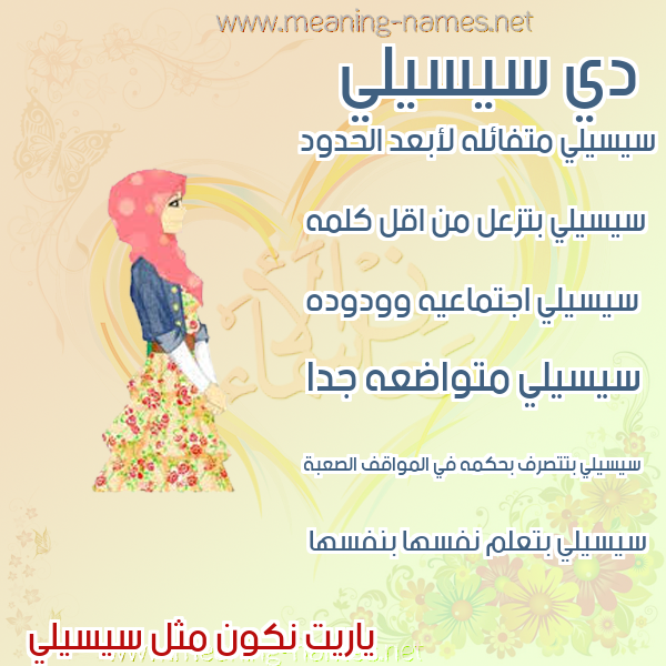 ما معنى اسمي سيسيلي ؟ sdsdgd ? what the meaning of sisily معاني كلمة سيسيلي قاموس الأسماء و المعاني و الكلمات .