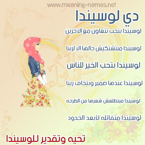 لوسيندامعنى الاسم لوسينداأصل الاسم أعجميإنتشر اسم لوسيندا مؤخراً، وهو اسم اعجمي يعني صاحبة الوجه الحسن أو المضيء، وتتسم صاحبة اسم لوسيندا بالشخصية الجذّابة والمهتمة بنفسها وجمالها. كما أنها شخصية إجتماعية وتحب تكوين العلاقات، وهي لبقة في حديثها ولديها حجج ومببرات لما تقوله لأنها لا تقول إلا ما تقتنع به. وهي أيضاً فتاة طموحة وتحب عملها وتنجح فيه، لديها خطط كثيرة تسير عليها في طريقها لتحقيق الأهداف.