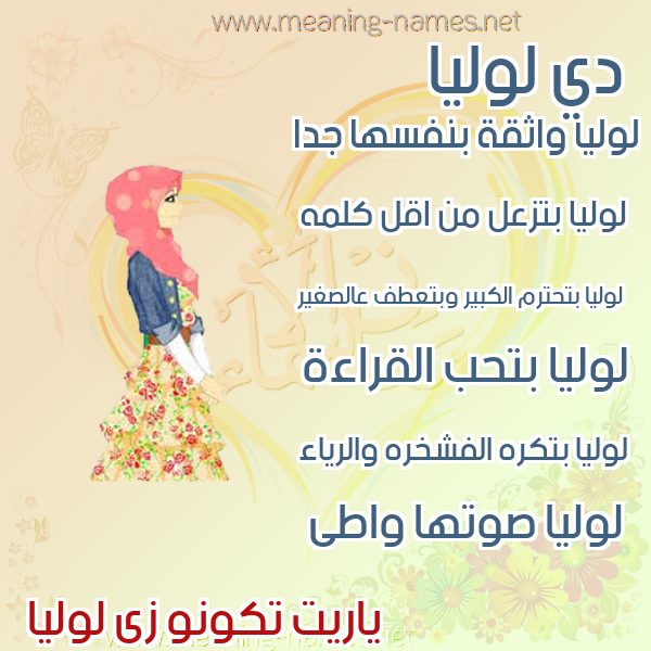 لوليامعنى الاسم لولياأصل الاسم أجنبياسم مؤنث ينتشر في بلاد الخليج، وفي العالم العربي يعتبر اسم مدلل مأخوذ من لؤلؤة، واسم لؤلؤة هو الدرة الثمينة في البحر، ويتم إستخراجها من الصدف، واللؤلؤ أحد الأحجار الكريمة الذي يتسم باللون الأبيض، ويستخدم في الحلي وتزيين النساء، ويوحي بقيمة الشىء وثمنه الباهظ. ويقال أن له معنى آخر وهو النجمة البرّاقة، ويوجد مدينة سويدية بإسم لوليا. وصاحبة اسم لوليا هي فتاة معتزة بذاتها، تهتم بأناقتها، كما أنها مفعمة بالأنوثة وجذابة في شخصيتها أيضاً، لا تحب التواجد في الأماكن المزدحمة، وتفضل السكون والهدوء.
