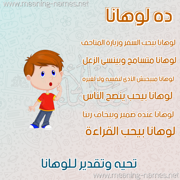 لوهانامعنى الاسم لوهاناأصل الاسم إنجليزياسم إنجليزي يطلق على الإناث، ويعني الضوء أو النور والسطوع، وهو اسم مميز وغير منتشر في الدول العربية. وصاحبة اسم لوهانا تتميز بشخصيتها المستقلة، تستطيع تحمل المسؤوليات ولديها صبر وتحمل، ولكنها متقلبة المزاج.
