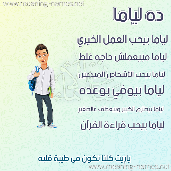 ليامامعنى الاسم لياماأصل الاسم أجنبياسم أيرلندي مأخوذ من اسم ليام، ويعني الشخص الحامي أو المدافع، الذي يقوم بحماية غيره، وهو اسم جديد وغير منتشر. وصاحبة اسم لياما تتمتع بشخصية قوية وجادة، متعاونة وتحب مساعدة الناس، كما أنها جريئة وتحب المغامرات.