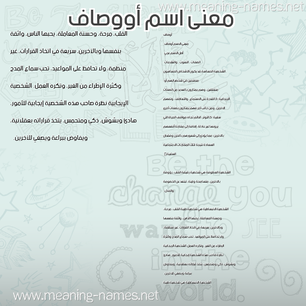 ما معنى اسمي أووصاف ؟ H,,wht ? what the meaning of Awsaf معاني كلمة أووصاف قاموس الأسماء و المعاني و الكلمات .