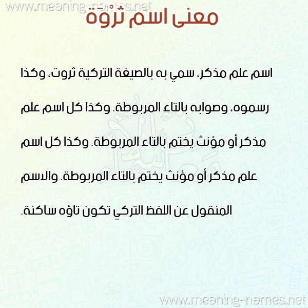 اسم علم مذكر، سمي به بالصيغة التركية "ثروتْ"، وكذا رسموه، وصوابه بالتاء المربوطة. وكذا كل اسم علم مذكر أو مؤنث يُختم بالتاء المربوطة. وكذا كل اسم علم مذكر أو مؤنث يُختم بالتاء المربوطة. والاسم المنقول عن اللفظ التركي تكون تاؤه ساكنة.