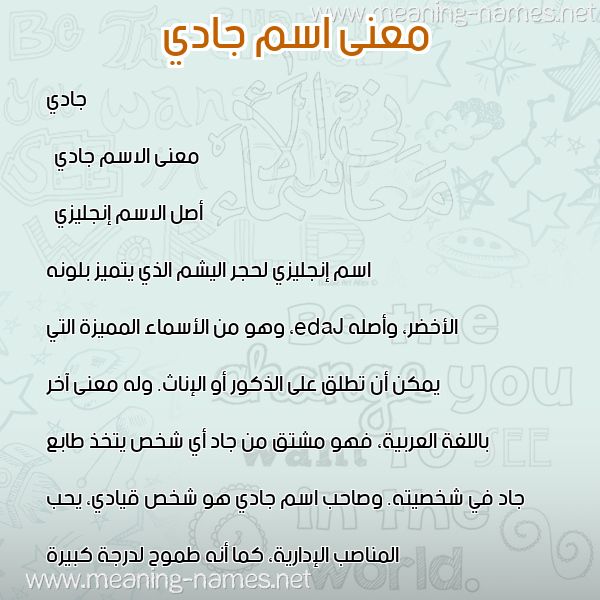 جاديمعنى الاسم جاديأصل الاسم إنجليزياسم إنجليزي لحجر اليشم الذي يتميز بلونه الأخضر، وأصله Jade، وهو من الأسماء المميزة التي يمكن أن تطلق على الذكور أو الإناث. وله معنى آخر باللغة العربية، فهو مشتق من جاد أي شخص يتخذ طابع جاد في شخصيته. وصاحب اسم جادي هو شخص قيادي، يحب المناصب الإدارية، كما أنه طموح لدرجة كبيرة ومتفاءل، وهو صارم في تعامله مع الناس وحتى في تربية الأطفال.
