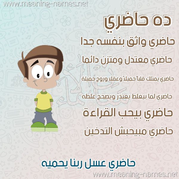 ما معنى اسمي حاضري ؟ phqvd ? what the meaning of HADRI معاني كلمة حاضري قاموس الأسماء و المعاني و الكلمات .