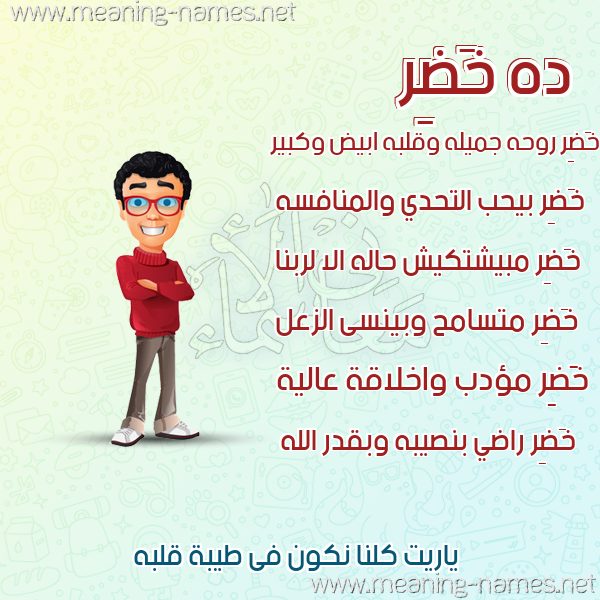 ما معنى اسمي خَضِر ؟ oQqAv ? what the meaning of KHADER معاني كلمة خَضِر قاموس الأسماء و المعاني و الكلمات .