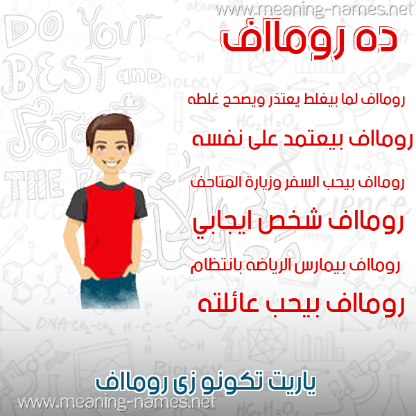 رومافمعنى الاسم رومافأصل الاسم عربياسم عربي يطلق على الذكور والإناث، ويعني شمس الحق، وهو من أسماء المواليد غير المنتشرة في الدول العربية. وصاحب اسم روماف يتمتع بشخصية قوية وجادة، متفاءل إلى حد كبير ولكنه عصبي وحاد الطباع ومتقلب المزاج.الشّخصيّة العَطوفة: هي شخصيّة رقيقة القلب، رؤوفةٌ بالآخرين، مُتسامِحة وليّنة، تبتعد عن الخصومة والجَدَل.الشخصية الاجتماعية يُعرف أصحاب هذا النوع من الشخصيات بحبّهم للاهتمام والتواصل مع أفراد المجتمع، ولذا فهم يستخدمون مهارات الاتصال، وعلاقاتهم بالناس في الوصول إلى نجاحاتهم، ومن المعروف لدى هؤلاء الأشخاص حبّهم للكلام والثرثرة، وهم قادرون جداً على جذب الآخرين إليهم، كما أنّهم يتميزون بالنشاط ويمتلئون بالطاقة عند العمل مع الآخرين، وغالباً ما تبدو عليهم علامات التفاؤل، والمزاج