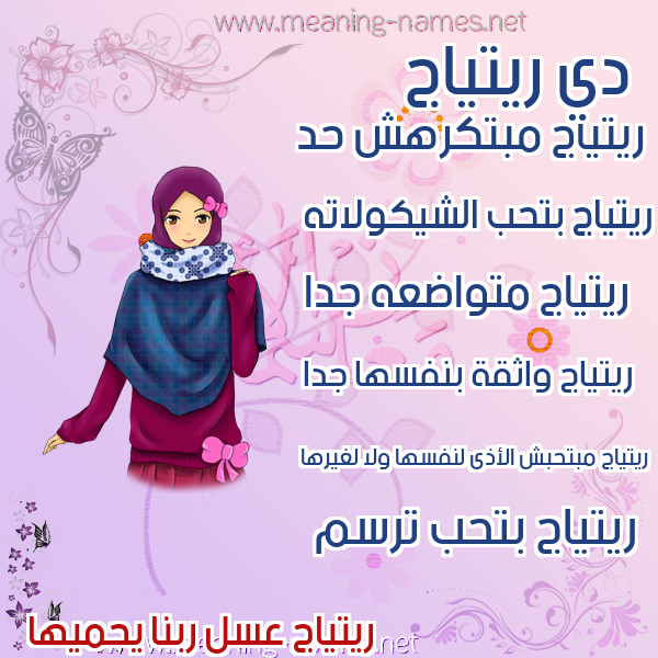 ريتاجمعنى الاسم ريتاجأصل الاسم عربييعني إسم رتاج الباب العظيم، ولكن بدون إضافة الياء إلى الإسم، ولكن تم تحريفه وكتابته بهذه الطريقة التي أصبحت الأكثر إنتشاراً "ريتاج" بدلاً من "رتاج"، ويمكن أن يمثل باب عظيم للقصر فيقال "ريتاج القصر" أو الباب العظيم للكعبة ويقال "ريتاج الكعبة"، ويقال "أرتج الباب" أي أغلقه. وتتسم صاحبة إسم ريتاج بالإنغلاق على نفسها والميل لصداقات محددة وعدم تكوين صداقات جديدة، ولكنها شخصية تبحث عن النجاح وتنظر إلى الطموح البعيد.يعني إسم رتاج الباب العظيم، ولكن بدون إضافة الياء إلى الإسم، ولكن تم تحريفه وكتابته بهذه الطريقة التي أصبحت الأكثر إنتشاراً "ريتاج" بدلاً من "رتاج"، ويمكن أن يمثل باب عظيم للقصر فيقال "ريتاج القصر" أو الباب العظيم للكعبة ويقال "ريتاج الكعبة"، ويقال "أرتج الباب" أي أغلقه. وتتسم صاحبة إسم ريتاج بالإنغلاق على نفسها والميل لصداقات محددة وعدم تكوين صداقات جديدة، ولكنها شخصية تبحث عن النجاح وتنظر إلى الطموح البعيد.