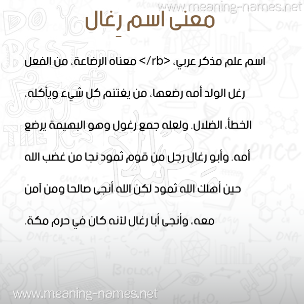 معناه: الرضاعة، من الفعل رغلَ الولدُ أمَّه: رضعها، من يغتنم كلَّ شيء ويأكله، الخطأ، الضلال. ولعله جمع رَغول وهو البهيمة يرضع أمَّه. وأبو رغال: رجل من قوم ثمود نجا من غضب الله حين أهلك الله ثمود لكن الله أنجى صالحاً ومن آمن معه، وأنجى أبا رغال لأنه كان في حرم مكة.