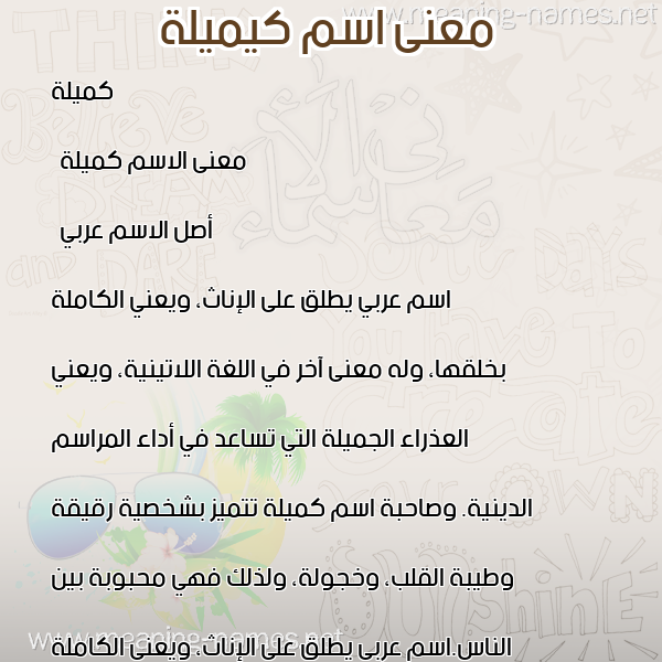 ما معنى اسمي كيميلة ؟ ;dldgm ? what the meaning of Kamila معاني كلمة كيميلة قاموس الأسماء و المعاني و الكلمات .