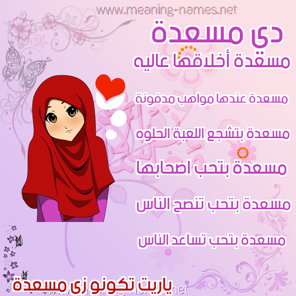 ( مَسْعَدَة ) : السعيد ، الميمون ، والذي يُسعد غيره .و معنى الاسم مسعدة : تدخل السعادة والسرور على غيرها أو من حولها.