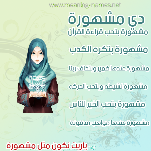 ما معنى اسمي مشهورة ؟ lai,vm ? what the meaning of MSHHORH معاني كلمة مشهورة قاموس الأسماء و المعاني و الكلمات .