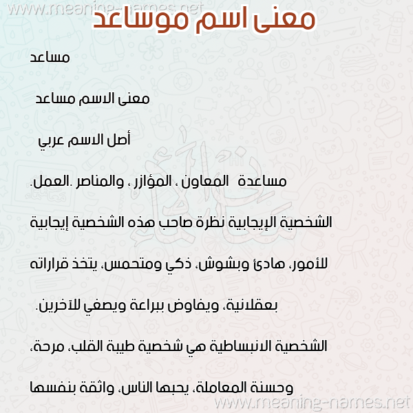 ما معنى اسمي موساعد ؟ l,shu] ? what the meaning of Mosaed معاني كلمة موساعد قاموس الأسماء و المعاني و الكلمات .