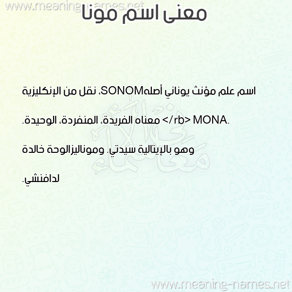 ما معنى اسمي مونا ؟ l,kh ? what the meaning of MONA معاني كلمة مونا قاموس الأسماء و المعاني و الكلمات .