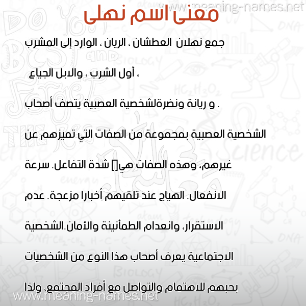 ما معنى اسمي نهلى ؟ kign ? what the meaning of NHLA. معاني كلمة نهلى قاموس الأسماء و المعاني و الكلمات .