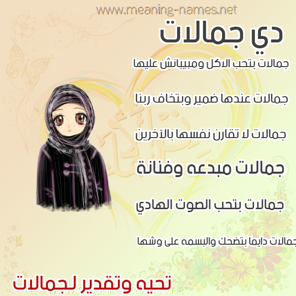 ما معنى اسمي جمالات ؟ [lhghj ? what the meaning of GMALAT معاني كلمة جمالات قاموس الأسماء و المعاني و الكلمات .