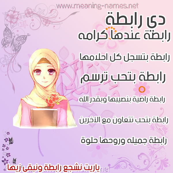 ما معنى اسمي رابطة ؟ vhf'm ? what the meaning of Rabth معاني كلمة رابطة قاموس الأسماء و المعاني و الكلمات .