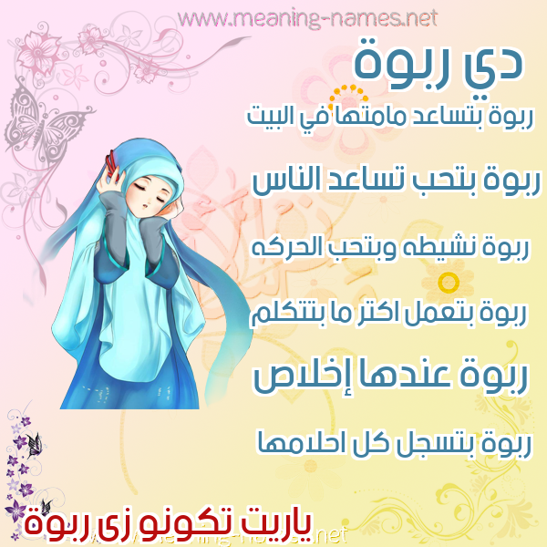ربوة: اسم يعطي ايحاء بالخصب والنمو، العلو والارتفاع وقد تكونين ربوة او رابية او ربى فالكل جميل فالشعراء قد تغنو بالروابى الخضر والربى وجمالها فى الربيع وعطرها الفواح ومن كانت رابية فهى نامية مكتملة ناضرة