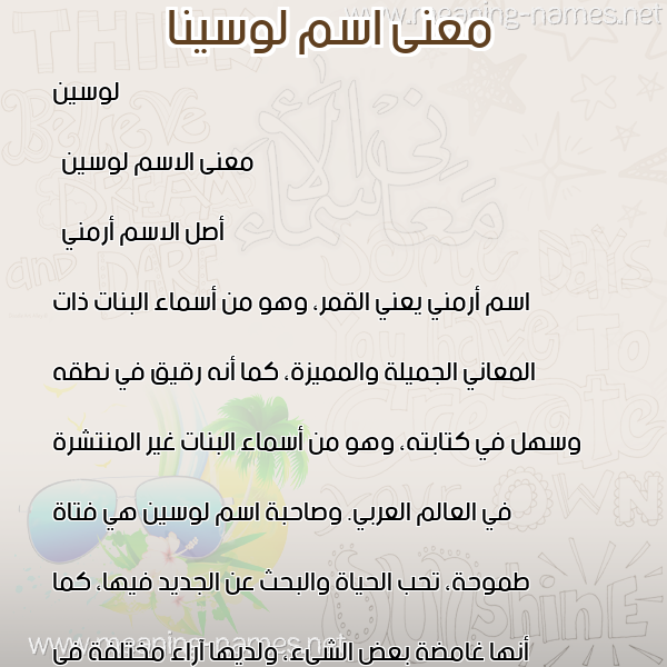ما معنى اسمي لوسينا ؟ g,sdkh ? what the meaning of locina معاني كلمة لوسينا قاموس الأسماء و المعاني و الكلمات .