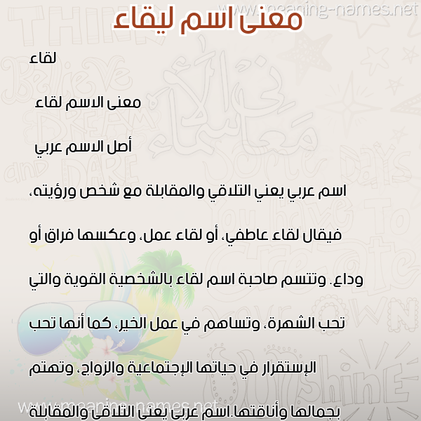 ما معنى اسمي ليقاء ؟ gdrhx ? what the meaning of Leqaa معاني كلمة ليقاء قاموس الأسماء و المعاني و الكلمات .
