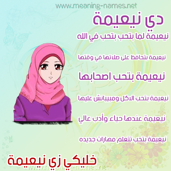 ما معنى اسمي نيعيمة ؟ kdudlm ? what the meaning of Naeema معاني كلمة نيعيمة قاموس الأسماء و المعاني و الكلمات .