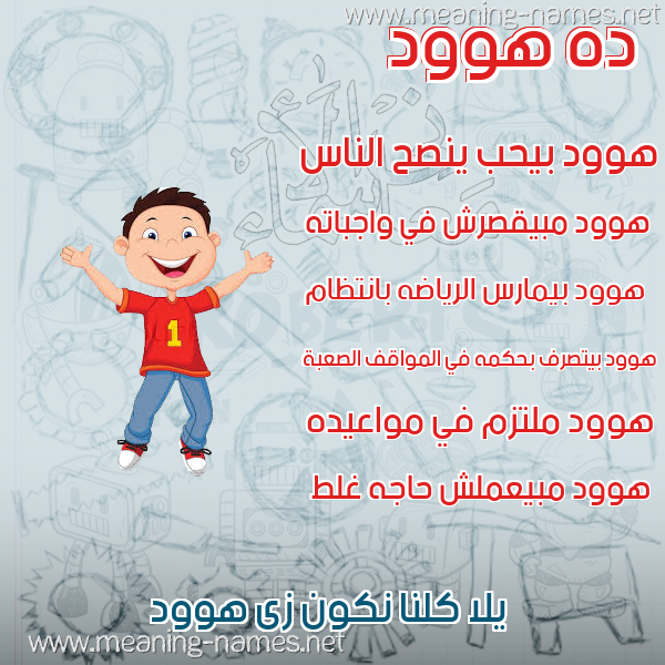 هودمعنى الاسم هودأصل الاسم عربياسم علم أصله عربي مذكر موضوع، ولا توجد أي علاقة للاسم باسم اليهود. سمي به على اسم النبي الذي أرسله الله إلى قوم عاد هود بن عبد الله حفيد نوح. وذكر في القران الكريم في قوله تعالى: ﴿أَلا إِنَّ عَادًا كَفَرُواْ رَبَّهُمْ أَلاَ بُعْدًا لِّعَادٍ قَوْمِ هُودٍ﴾ . اسم هود من الاسماء الجميلة والمحببة لدى الكثير من العرب فهو اسم نبي الله هود عليه السلام.للاسم باسم اليهود. سمي به على اسم النبي الذي أرسله الله إلى قوم عاد هود بن عبد الله حفيد نوح. وذكر في القران الكريم في قوله تعالى: ﴿أَلا إِنَّ عَادًا كَفَرُواْ رَبَّهُمْ أَلاَ بُعْدًا لِّعَادٍ قَوْمِ هُودٍ﴾ . اسم هود من الاسماء الجميلة والمحببة لدى الكثير من العرب فهو اسم نبي الله هود عليه السلام.