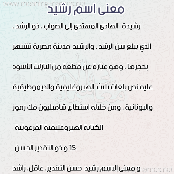 ( رَشِيْدَة ) : الهادي المهتدي إلى الصواب ، ذو الرُّشد ، الذي يبلغ سنّ الرُّشد . والرشيد : مدينة مصرية تشتهر بحجرها ، وهو عبارة عن قطعة من البازلت الأسود عليه نص بلغات ثلاث : الهيروغليفية والديموطيقية واليونانية ، ومن خلاله استطاع شامبليون فكّ رموز الكتابة الهيروغليفية الفرعونية *(15).و ذو التقدير الحسنو معنى الاسم رشيد : حسن التقدير، عاقل، راشد ومرشد إلى الطريق المستقيم.